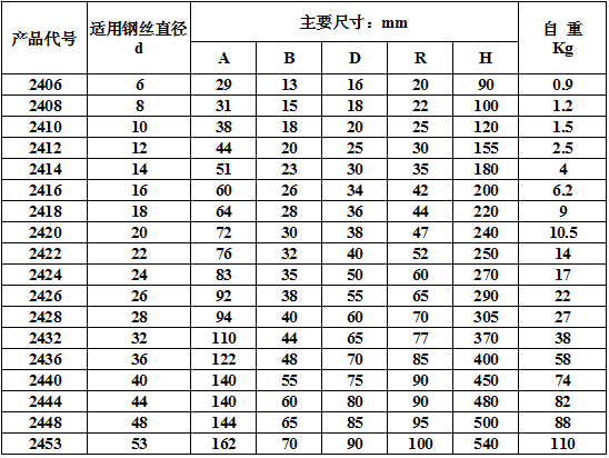 楔形接头采用合金钢锻造焊接而成, 适用于强度要求较高的特殊工况和特殊作业环境.如:抓斗钢丝绳连接;起重机钢丝绳连接;大型设备及机械钢丝绳的连接等。