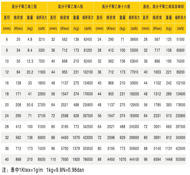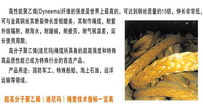 高性能聚乙烯纤维,可达到钢丝质量的15倍,伸长低,可与金属钢丝其断裂伸长度相媲美。其制作绳缆,耐紫外线辐射,耐海水,耐酸碱,耐疲劳,耐气候温差,延长使用周期。