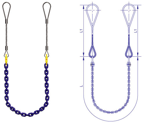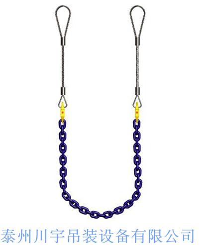 • 钢坯专用链条索具是专业用于吊装钢坯的组合索具,钢丝绳索具与链条索具之间用相应吨位的长吊环连接,链条与吊环之间可以用连接环连接也可以用链条卸扣连接。