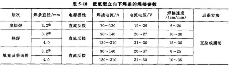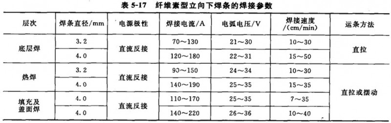 (3)管道立向下焊接参数管道立向下焊接遵循多层多道焊的原则。应根据不同的管材、输送介质选择不同的焊条。输气管线原则上选用低氢型立向下焊条,输油、水管线选用纤维素型立向下焊条。立向下焊接均采用直流电流反极性接法。纤维索型立向下焊条的焊接参数见表5—17,低氢型立向下焊条的焊接参数见表5—18。